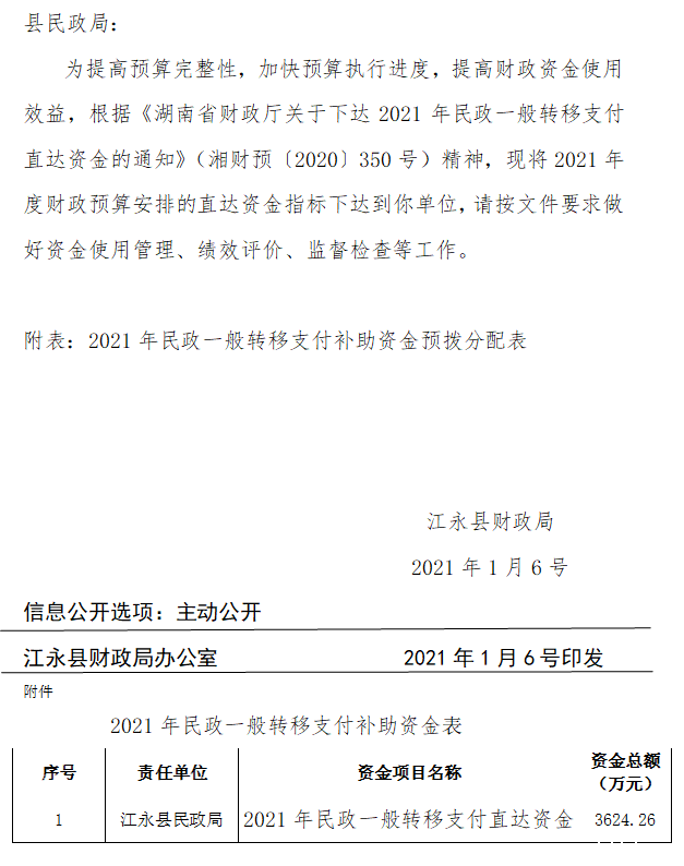 关于下达2021年民政一般转移支付预算指标直达资金的通知