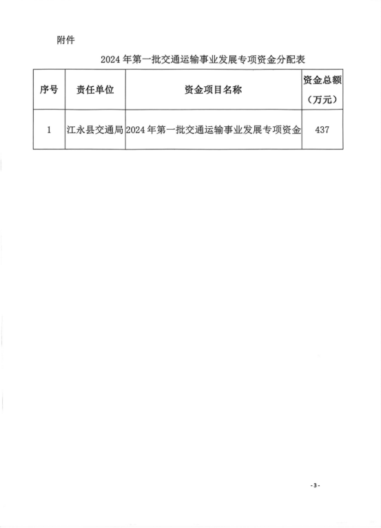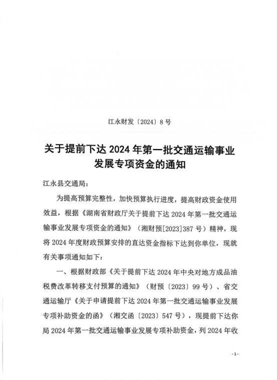 关于提前下达2024年第一批交通运输事业发展专项资金的通知(江永财发〔2024〕8号)