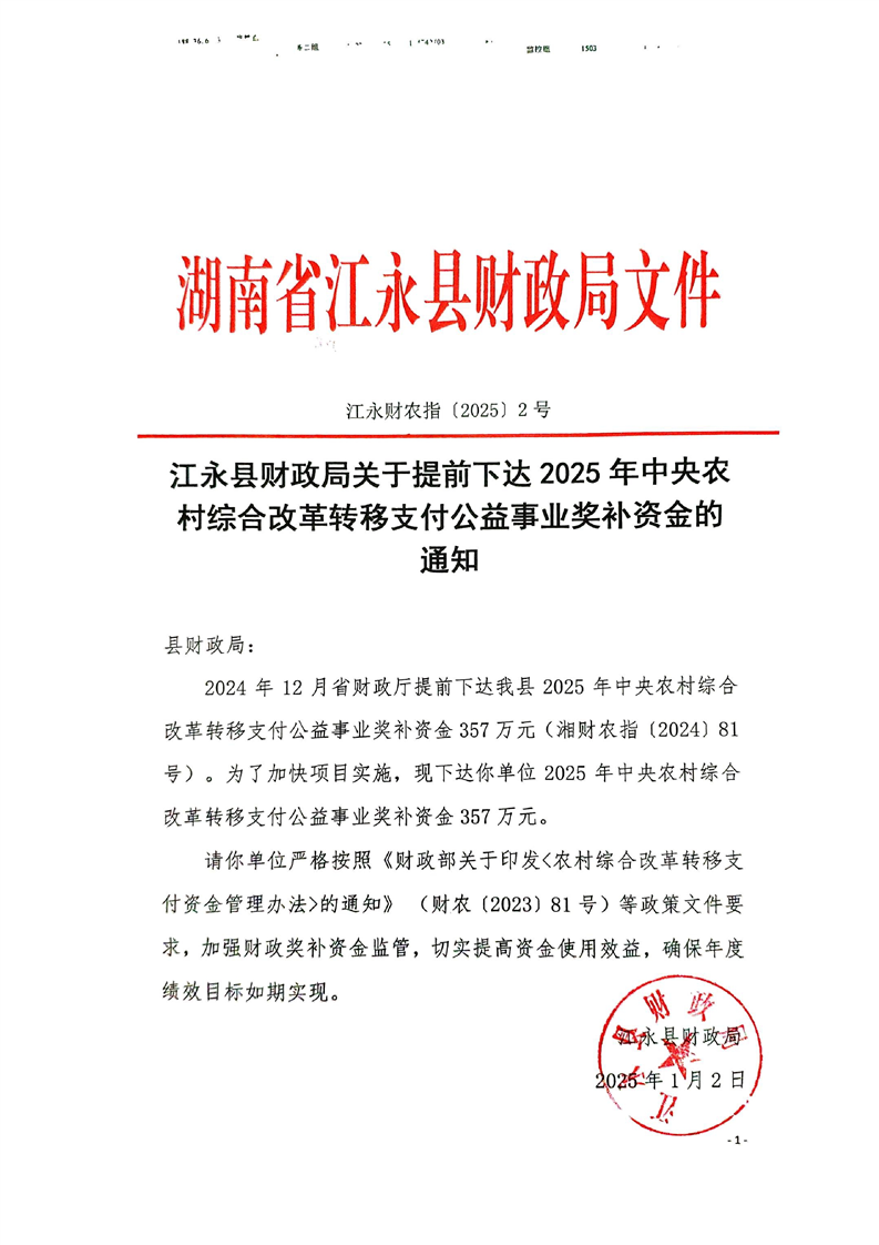优米体育足球财政局关于提前下达2025年中央农村综合改革转移支付公益事业奖补资金的通知(江永财农指[2025]2号文件)