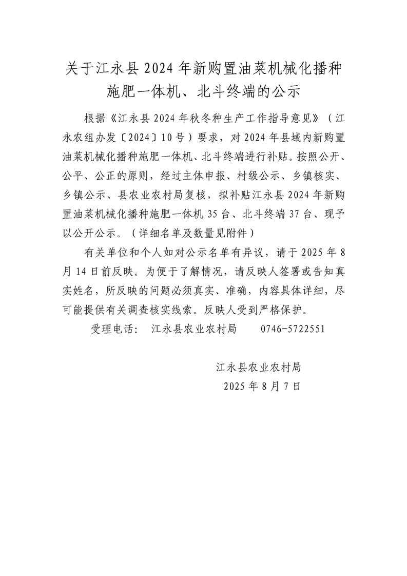 关于优米体育足球2024年新购置油菜机械化播种施肥一体机、北斗终端补贴公示
