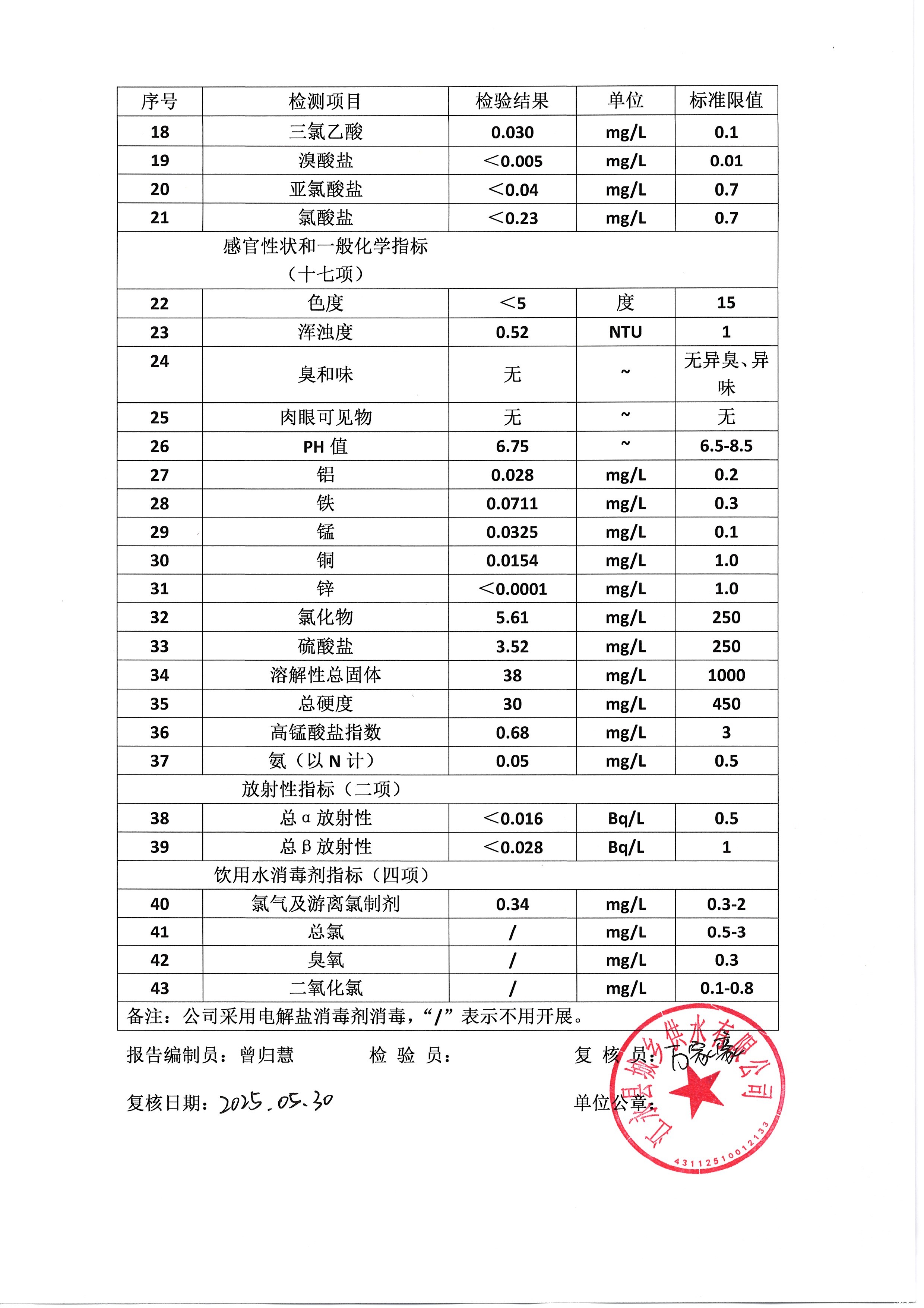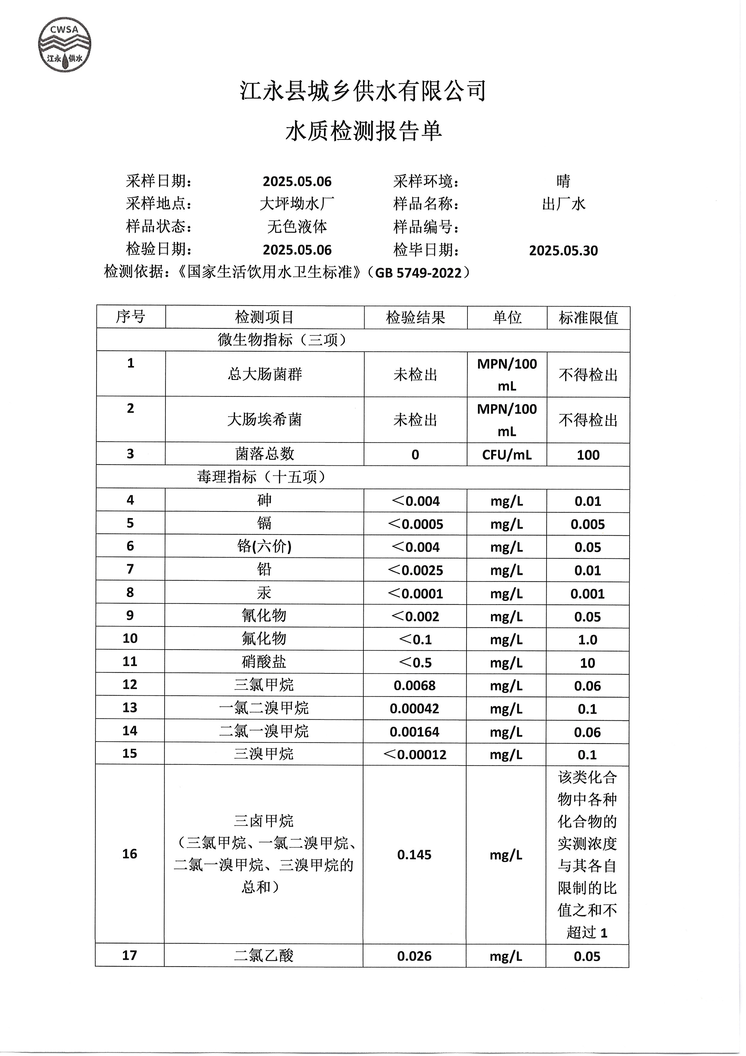 2025年优米体育足球城乡供水事务中心出厂水质检测报告单(5月)